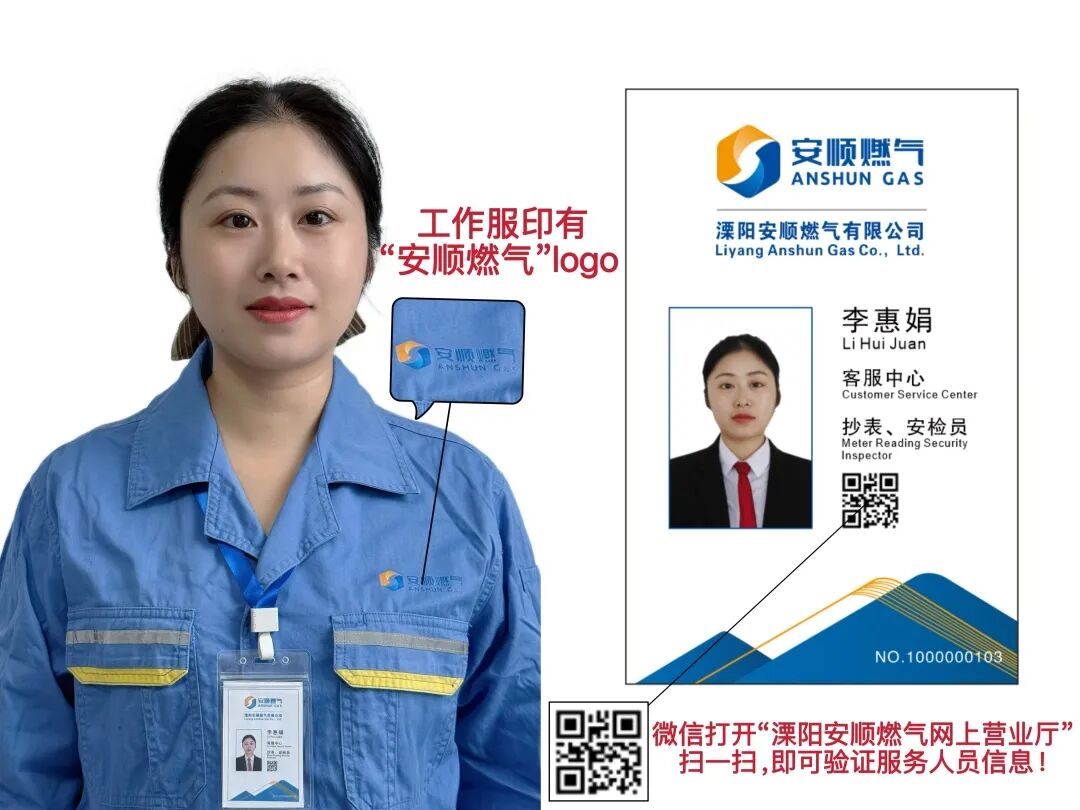 1、溧阳安顺燃气工作人员上门服务都按规定穿着印有“安顺燃气”logo的蓝色工作服,并且佩戴印有员工信息二维码的工作牌。