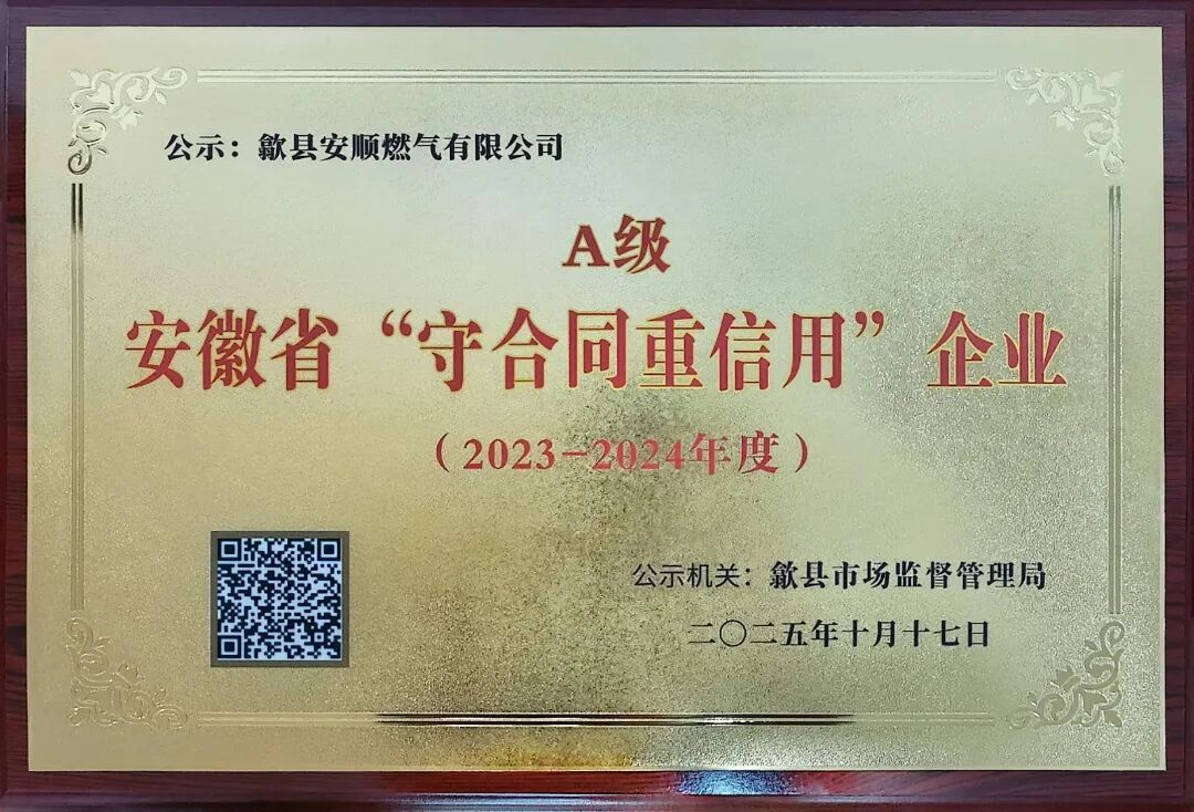 近日,安徽省2025年度“守合同重信用”企业评选结果揭晓,歙县安顺燃气有限公司凭借其在长期经营中始终如一的诚信实践与卓越的合同管理能力,成功获评A级荣誉称号。