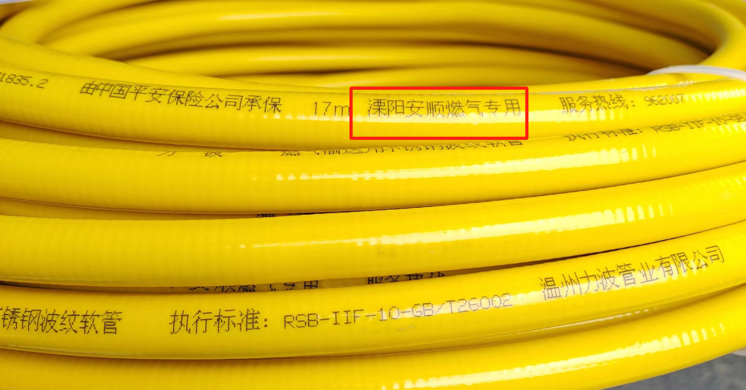 2、我公司的不锈钢波纹管印有“溧阳安顺燃气专用”字样。