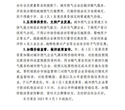 根据文件要求,将于2023年二季度起全面实行非居民管道天然气价格联动机制,2023年二季度气价政策调整主要内容如下: