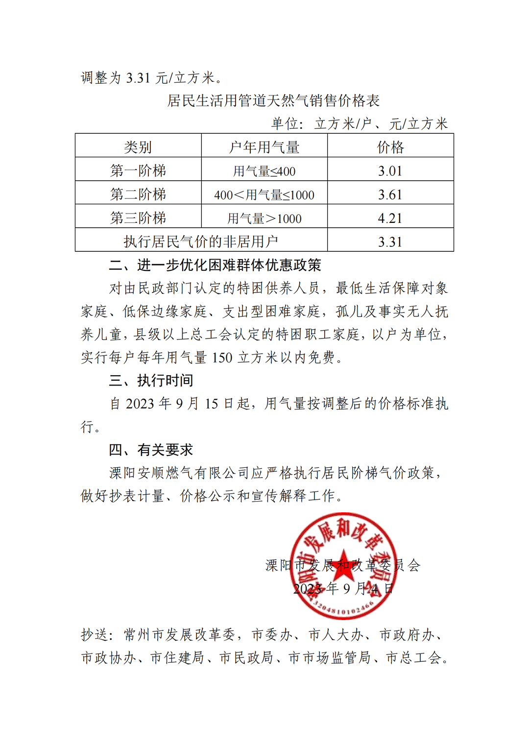 您好!根据溧阳发改委《关于调整居民用管道天然气销售价格有关事项的通知》(溧发改【2023】205号)文件的要求,现就调整通知如下: