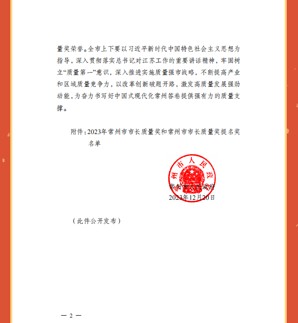常州市市长质量奖是常州市人民政府设立的质量领域最高奖项,授予实施卓越绩效管理、取得显著经济效益和社会效益的企事业单位。