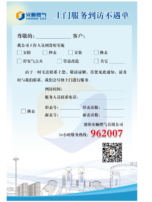 当您在家门口看到了《上门服务到访不遇单》,请及时与通知单上预留的电话联系,也可以联系溧阳安顺燃气24小时服务抢修热线962007,与工作人员约定好上门时间配合入户安检,完成燃气安全检查工作。